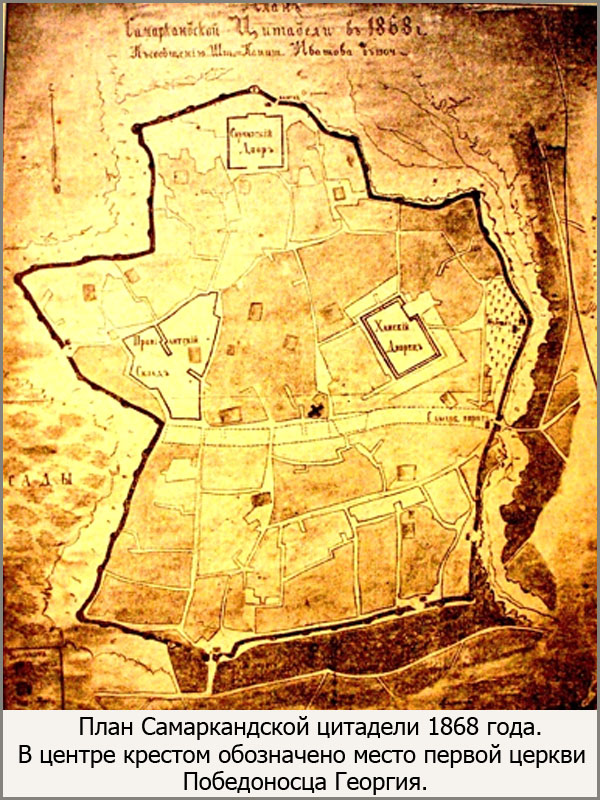 Но, что важно, самой первой архитектурной постройкой в ней, стал возведенный в 1868 году, духовно образующий центр – военный православный храм во имя Святого Великомученика и Победоносца Георгия. Он белел, выделяясь, на фоне остальных зданий. Стоит заметитть, что практически все храмы и священники того времени в Туркестане, были военными. Место под постройку храма было выделено в середине цитадели, на главной улице, возле здания управления. Оно представляло собою прямоугольное, однозальное сооружение с отдельной алтарной частью, под плоской крышей и примыкающей к нему двухэтажной колокольней. Снаружи оно было украшено со всех сторон декоративными полуколоннами и лепными фронтонами, увенчанными крестами. Внутри, по описаниям путешественников, церковь так же имела колонны и различные декоративные украшения, которые придавали ей лёгкий и грациозный восточный колорит. Несмотря на простоту архитектурного решения, эта церковь была самым значительным и красивым сооружением в цитадели. По некоторым сведениям, в её украшении принимали участие местные самаркандские мастера. Этот храм считался самым лучшим, из всех церквей, воздвигнутых к тому времени в Туркестане. Его строительство обошлось в три тысячи рублей. По воспоминаниям очевидцев, здание военной церкви было единственным оригинальным сооружением внутри цитадели, «красующееся снаружи и изящно украшенное изнутри». На её постройку ушло около пяти месяцев, и к декабрю оно уже функционировало, и в нём велись службы. Это был самый первый и на протяжении последующих четырнадцати лет, единственный православный храм Самарканда. Здание этой церкви не сохранилось до наших дней, оно стало разрушаться ещё в начале прошлого века. Но сохранилось его изображение и имя первого настоятеля – священника 6-го Туркестанского стрелкового полка протоиерея Николая Георгиевича Высоцкого. До Самарканда отец Николай был учителем Оренбургского Духовного Училища, но в 1868 году он был направлен в Туркестан. Он был настоятелем в самаркандском храме 11 лет. После чего он служил ещё в городах; Верный, Аулиеота и Чарджоу до 1914 года. Позже, оставаясь военным священником он принимал участие в первой мировой войне вместе со своим батальоном, и 15 июля 1915 года, за отличие в военных дествиях был награжден сразу двумя боевыми орденами: святого Владимира четвёртой степени «с мечами», и святого Владимира третьей степени «с мечами».