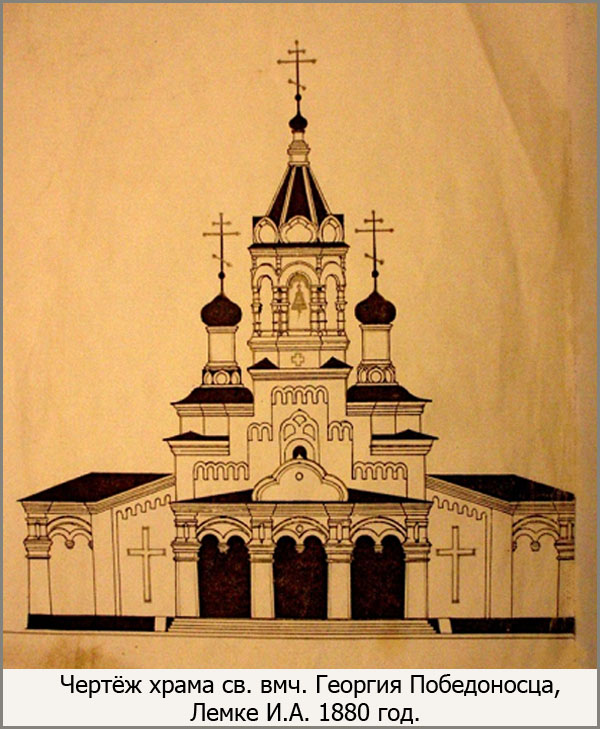 На смену первому храму, в 1880 году, младший самаркандский инженер-архитектор И.А. Лемке подготовил проект новой церкви, имеющий в плане форму креста и исполненный им в русском стиле. После этого, на средства от казны, уже в центре нового, русского города, напротив здания Офицерского собрания, строится новый храм во имя св.вмч. Георгия Победоносца.